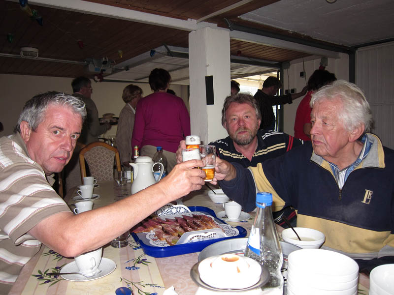 "Prost" den fleißigen Zeltaufbauern! Die Damen waren inzwischen auch nicht untätig. Die Tische sind eingedeckt, Schnittchen für die Helfer geschmiert usw.