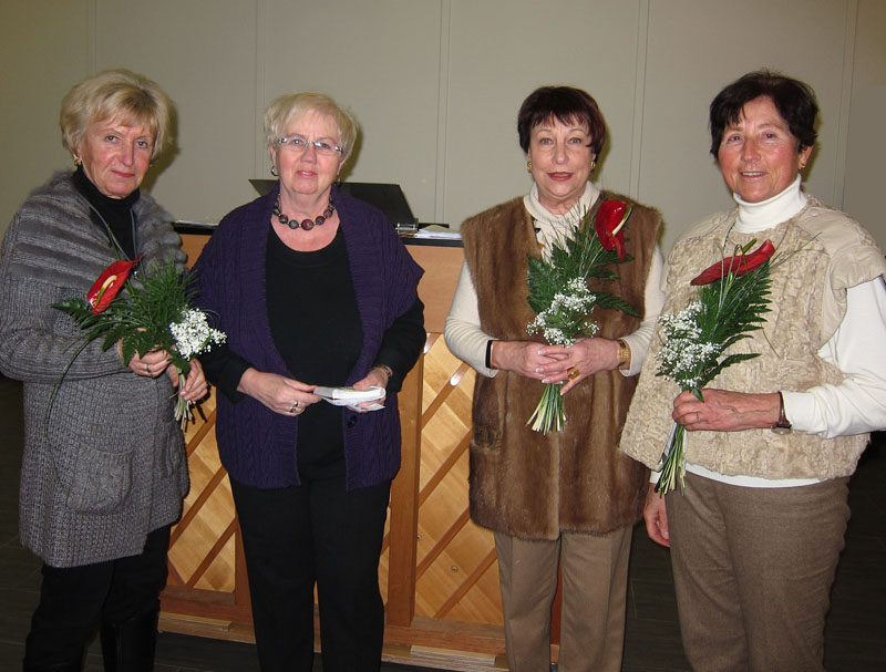 Am ersten Probentag nach der JHV wurde diesen drei "Stühlestellerinnen" aus Bad Lippspringe ein besonderer Dank mit einem kleinen Blumenstrauß ausgesprochen. Ihr Amt wird nun von 2 Herren ausgeübt. Von links: Margret Lappe, Hildegard Geppert (Vorsitzende), Ellen Birr und Lisa Kleine. Vielen Dank für eure jahrelange Tätigkeit bei jeder Chorprobe für alle Chormitglieder! |