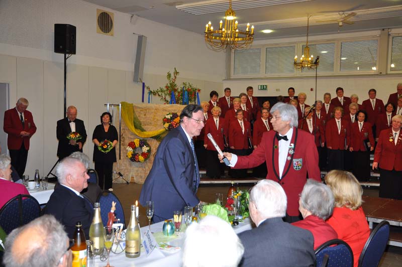 Alfons hält das Mikrophon, dass Gerhards Dankesworte besser zu hören sind.