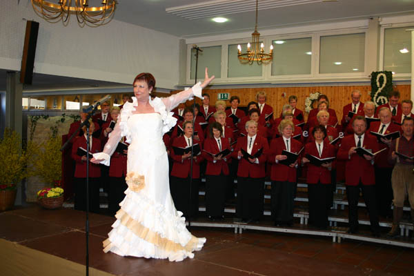 Dieses Foto hat die Bildnummer 07FKZ-010 Ellen May glänzte und brillierte im neuen, champagnerfarbenen Kleid als Solistin mit Begleitung des Chores und Konzertmeisterin Ellen Plem am Piano - sie bezog das begeisterte Publikum gekonnt mit ein. |