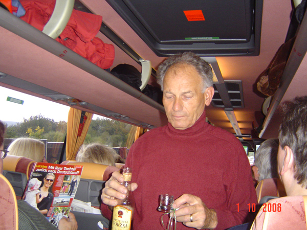 Dieses Foto hat die Bildnummer 08CHR-006 Ab und zu müssen kleine Stärkungen sein. In Bus 1 übernahm traditionell Rainer das Verwöhnen der Mitreisenden. |
