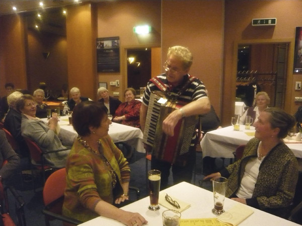 Dieses Foto hat die Bildnummer 08CHR-022 An einem Abend war ein Musiker bestellt, der uns mit gekonntem Erzählen, Musizieren und Singen verwöhnte. Und natürlich war das auch was für uns zum Mitsingen. Hier wird Ellen ein wenig "befragt". |