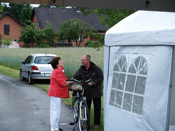 Dieses Foto hat die Bildnummer 08SJR-013 Und schon ist Samstag: Herr Pfarrer Grenz wird von der "Festwirtin" Elisabeth Jüde herzlich begrüßt. |