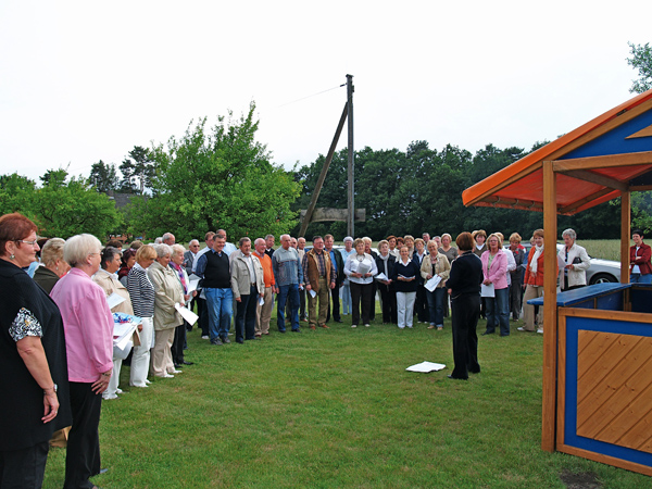 Dieses Foto hat die Bildnummer 08SJR-014 Wie jedes Jahr üblich: Zu Beginn des Festes am Samstag wird in der großen Runde "angesungen". Dieses Jahr ist Ellen Dirigentin, da Alfons leider verhindert ist. |