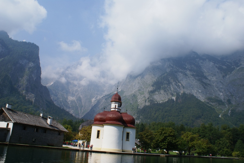 Die Kapelle St.Bartholomä mit dem Watzmann, dem Hausberg des Königsees.