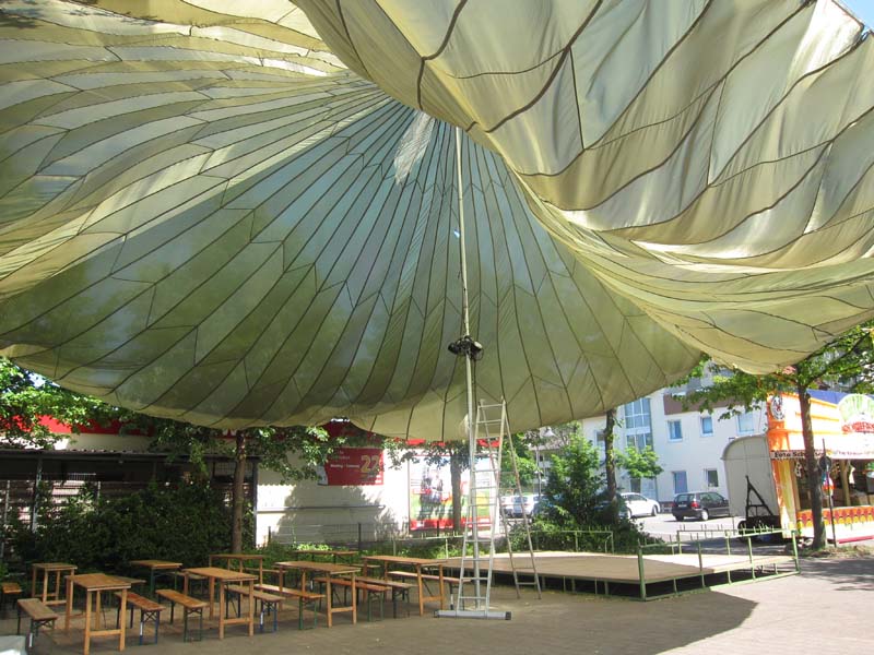 Vor der Halle wurde ein Biergarten errichtet, wobei ein großer Ballon installiert wurde, der zahlreichen Gästen Platz für Erholung im Schatten bot, z. B. mit einem Bier in der Hand oder etwas zu essen, zur Geselligkeit usw. - Eine sehr gute Idee!