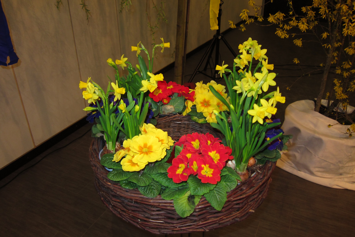 liebevoll arrangiert die Primeln und Narzissen |